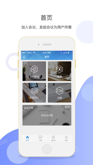【首页】包含加入会议、发起会议、直播、点播、会议日程功能。