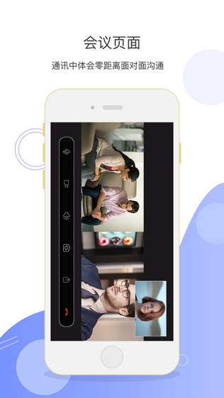 【会中控制】可进行开启/关闭语音、开启/关闭摄像头、切换前后置摄像头、在通讯中共享图片、静音、挂断等操作。