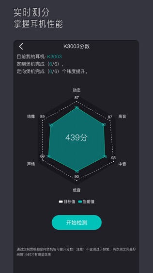 【定向提升计划】用户可以根据当前耳机的性能情况,对耳机六大维度(高音、中音、低音、结象、声场、动态)进行定向提升。