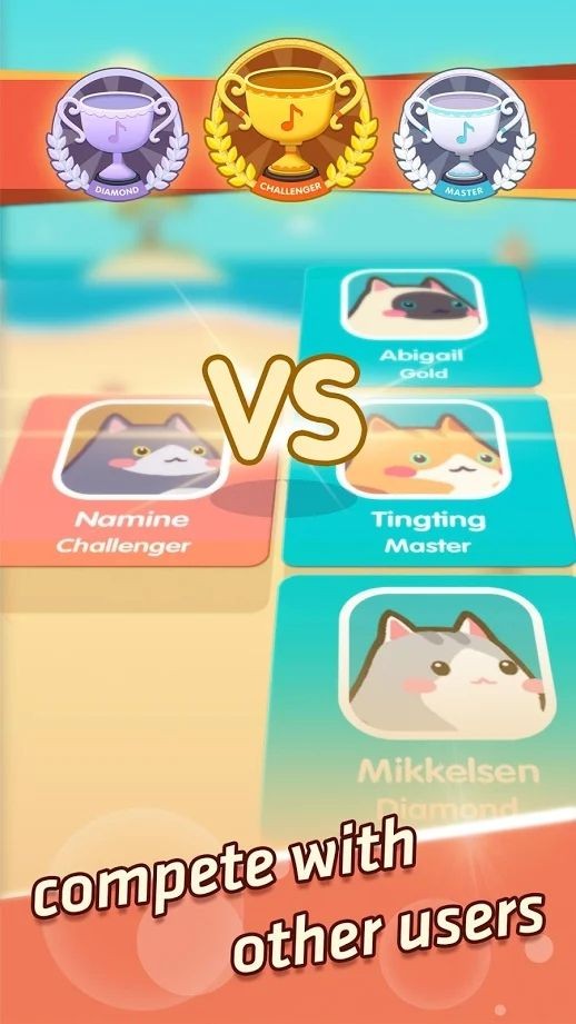 更可与其他玩家的猫咪进行同台竞技、比拼技术!跟着节奏点击下降的音符。