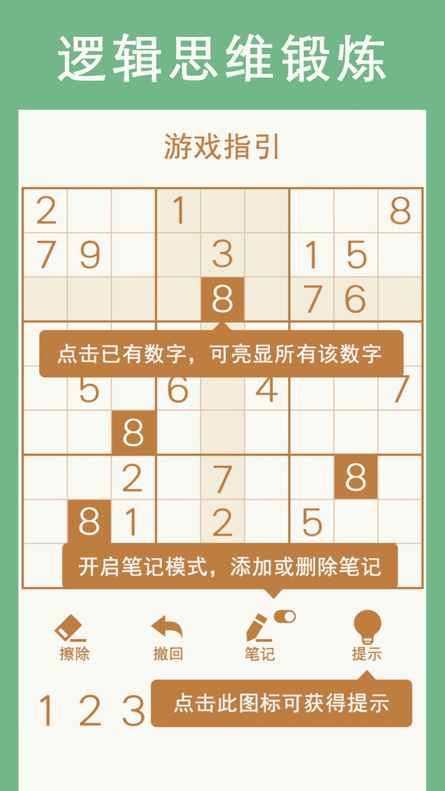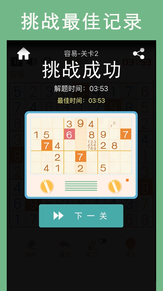 使1-9每个数字在每一行、每一列和每一宫中都只出现一次,即可完成挑战。