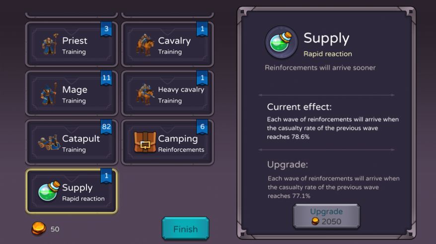 2、除开步兵团之外,游戏玩家能够慢慢解锁弓手、法师、轻骑兵、法师职业、重骑兵、燃火诸葛连弩配搭布署。