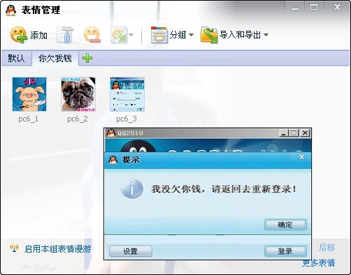 工作了一整天用这款你欠我钱qq表情还娱乐一下吧,你欠我钱什么时候还。。我没欠你钱,请返回重新登录,非常有意思的表情哦。直接在表情管理中导入表情即可。