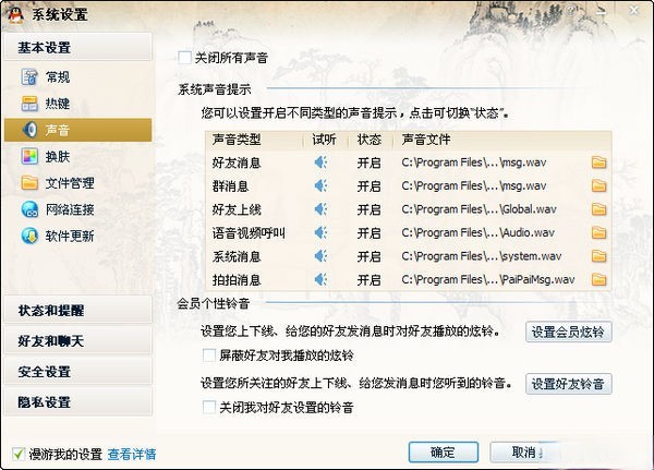 msg.wav为消息到达时的提示音,system.wav为系统消息提示音,Global.wav为好友上线时的声音,folder.wav为组之间进行切换时的声音,call.wav和ring.wav为拨打QQ电话时的声音提示!
