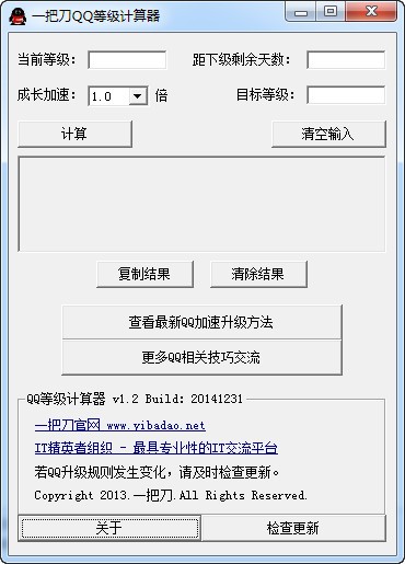 一把刀QQ等级计算器功能最全的QQ等级计算工具。最完善的QQ算法,实时更新,可以准确计算以指定速度升级到指定级别所需要的时间、可准确计算出从当前等级到皇冠所需要的活跃天数。人性化的计算方式非常易于使用。