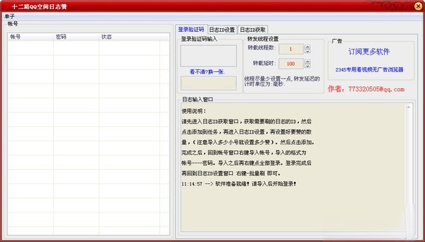 十二路QQ空间日志赞是一款可以批量刷QQ空间日志赞的小工具,需要登录小号,刷赞速度快,软件界面简洁,使用方便。