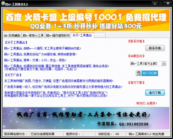 小巧实用的QQ工具集合,晓W-工具集合主要用于辅助QQ功能,让大家更爽快的使用QQ。部分杀毒对本程序报毒,如果发现报毒请把本程序加入到信任列表,重新启动本工具就OK!
