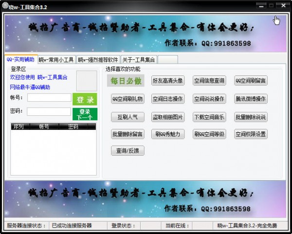 19、刷QQ空间等级,输入帐号即可一键开刷,状态显示日志,简单快捷;新增:可选择服务器号码或者自带号码,服务器号码则为无需小号QQ空间等级。