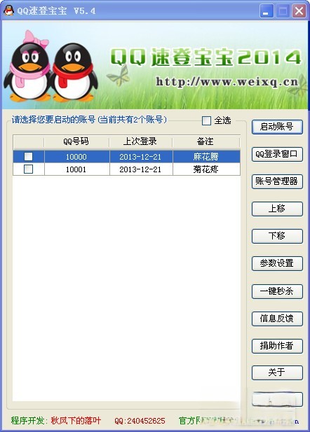 QQ速登宝宝是一款用于快速登录、关闭和管理QQ的软件。它可以免去每次登录QQ时输入号码与密码的麻烦,同时可以有效防止木马使用记录键盘盗号,并且具有号码管理、筛选、QQ快速登录和关闭等其他多种功能。速登宝宝用安全的加密方式保存您的QQ密码,并且可以随时导出号码和密码作为备忘查看,可以设置软件登陆密码以及密码取回保护问题,防止其他人使用宝宝登录自己的QQ,有效保障QQ安全和隐私。软件自动检查升级,完全免费,绿色安全!