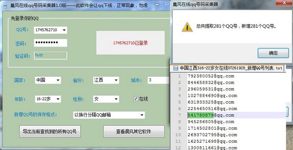 软件使用很简单,在软件上用任意大号小号(qq号)和密码登录之后,选择你想采集的目标qq所在的省会、城市、年龄、性别,然后点“导出当前查找到的所有qq号”按钮就可以自动采集完毕了,之后软件会自动打开保存的文件,你可以根据自己的需要按照分号或换行的方式保存每个qq号或每个qq形式的邮箱。