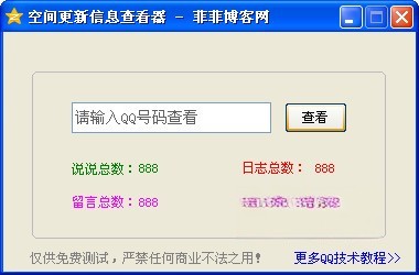 空间更新信息查看器是一款可查看加密空间的更新动态数量的软件,只需输入对方的QQ号码,点击“查看”即可看到说说总数、日志总数、留言总数、照片总数。