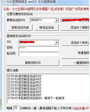 七七说说王是目前最好用的QQ空间说说转发软件 刷空间说说转发软件 可用多个小号对多个大号转发说说的说说转发工具,它具有以下特点: