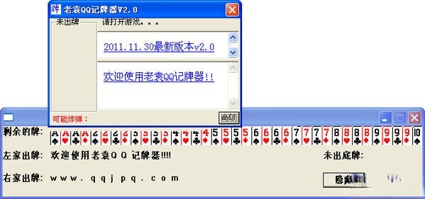 老袁QQ记牌器,支持qq游戏大厅中的欢乐斗地主和角色斗地主两个游戏,可记录左右玩家的出牌,剩余牌和未出的底牌。