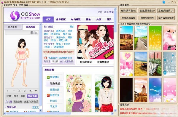 QQ秀免费领取器收集了六组免费QQ秀:意境QQ秀背景,恶搞QQ秀,可爱QQ秀等,QQ秀免费领取器内就可以免费试穿这些QQ秀,再保存就可以了。