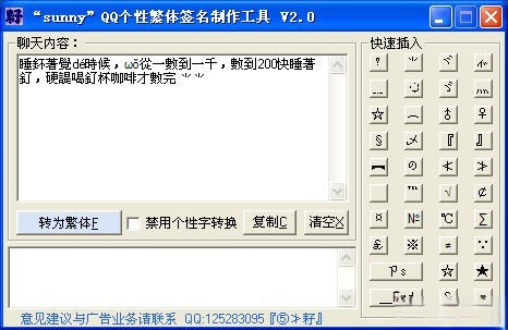 QQ繁体字个性签名生成器,把任何一句经典语句转换成超有个性的繁体字签名,能插入各种有趣的文字符号,最终转换成繁体签名类似火星文,的确很有个性的QQ签名。