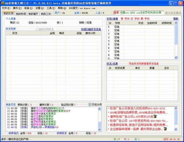 qq偷匪最新版三合一于2012年6月13号更新,是一款目前最好用的qq农场、牧场、餐厅、加工坊的辅助软件,自动收获和播种、偷取、除草、自动收获和买动物、偷取、赶生产、加草、打蚊子、收集便便等。