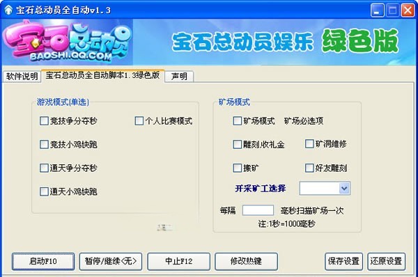 前台操作挂机,争分夺秒,小鸡快跑,个人比赛,矿场模式,默认自动领奖只支持QQ游戏大厅登录游戏操作步骤(启动脚本必须热键启动,默认F10启动,F12停止)注意