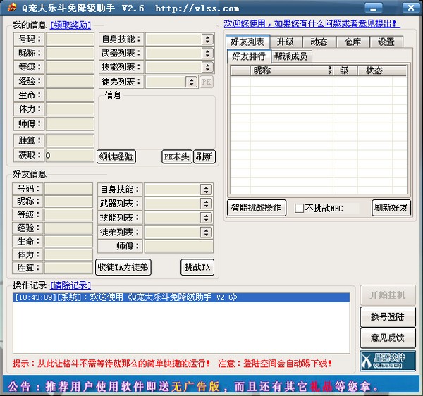 支持长时间挂机,可设置自动检查时间(注:登陆QQ空间或者登陆其他空间可能会导致系统踢出问题。这本是TX新技术,并非我们无能!)支持详细信息显示,包含技能、武器、师徒信息显示;并且能完整显示好友信息。