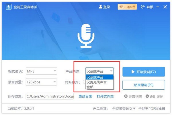 1、声音来源 软件录制支持[仅系统声音]、[仅麦克风声音]、[全部] 三种录制模式。可以满足不同场景下的不同录制需求。