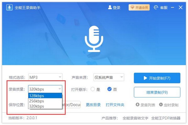 2、录音质量 软件支持输出的音频质量为[128kbps]、[256kbps]、[320kbps]。质量越高输出的音频品质越高,文件的大小也越大。