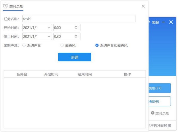 4、定时录制 定时录制功能可以设置定时任务,到预定时间后软件自动开启录制,自动结束录制。可以创建多个定时任务,选择录制的开始和结束时间,选择录制声音,然后创建任务。定时录制需要注意:软件必须处于启动状态,退出软件后定时任务会清空。