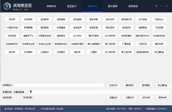 滨海易歪歪是一款多功能、多线程的频道卫士软件,内置音乐MV下载功能、主播音效功能、铃声制作、图文刷屏、语音朗读等多功能集于一身。使用易歪歪,解决主播 客服一切上网问题。