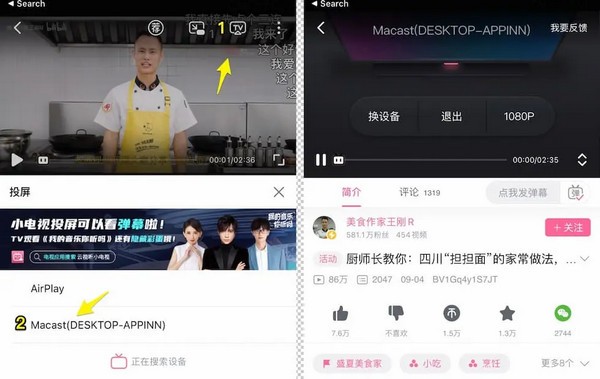 然后,就能在手机中使用投屏了,比如 bilibili,直线电机手机上的 TV 按钮,然后选择你的电脑名称,即可投屏:
