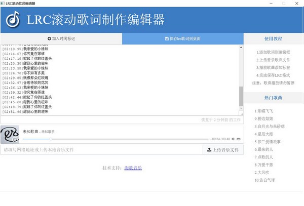 LRC滚动歌词制作编辑器,用户可自主在线编辑制作LRC滚动歌词,无需注册登录,方便操作,赶快下载使用吧!