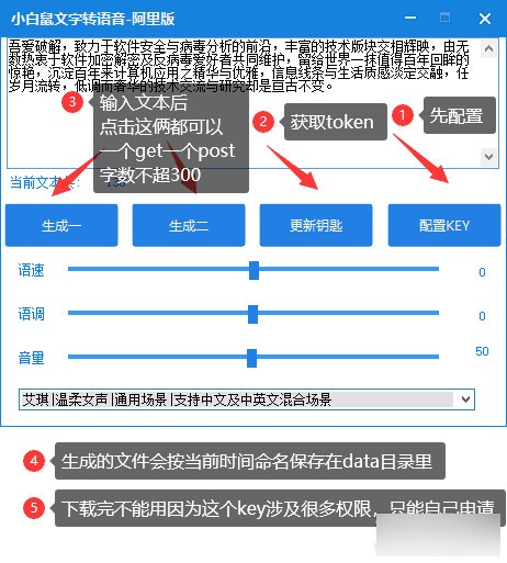 小白鼠文字转语音软件,采用阿里云接口,阿里云的语音生成,个人免费版,支持2线程自己用足够了,需要自己申请阿里云的AccessKey服务!
