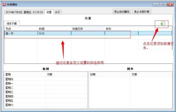 铃音播控最新版可以创建多种播放方案,每个方案可以包括多个节点的播放设置,每个播放设置,可以设置节点名称、播放音乐起始时间,播放的音乐文件,可以立即播放来测试。然后将这些方案指定到不同的时间,本周日到周六的任何一天。软件支持设置例外时方案,软件还支持手动停止播放。