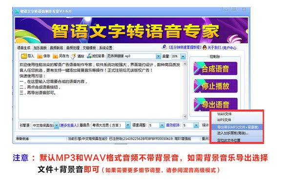 智语文字转语音助手是一款语音播报软件,全新技术,带乐一键合成,拒绝繁琐,30秒出效果,小巧轻便,启动很快,用起来还不错!