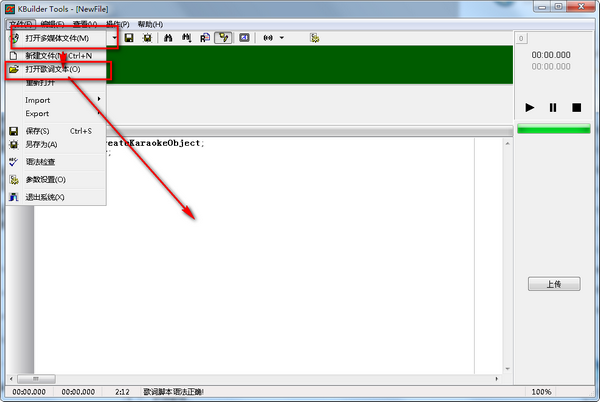 请注意原来的'符号变成了''(两个'符号),这是为了防止与字符串符号发生冲突。在工具栏上的打开按钮还可以快速打开最近所打开的歌词文件,与此相对应的功能是:文件菜单中有“重新打开”。