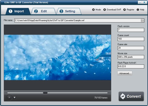 在“导入”页面上,单击浏览器按钮添加SWF文件。您可以获取有关此文件的Flash信息,并在转换前预览它。