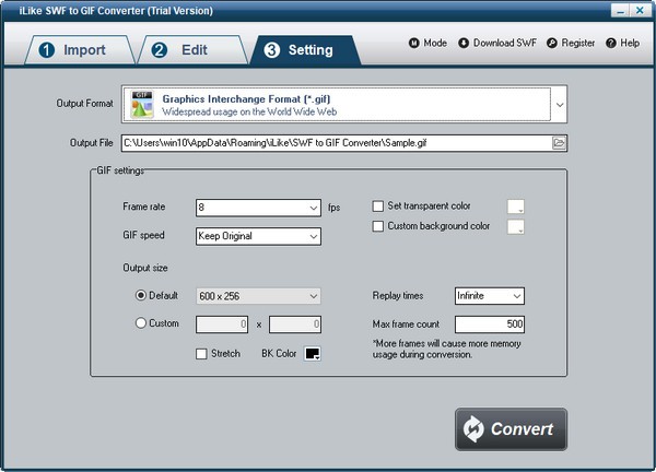 在“设置”页面上,指定输出文件。然后看一下gif设置。帧速率是指一秒钟内显示多少帧。高帧速率会导致更大的输出尺寸。将其设置为或小于SWF文件的帧速率。如果你想改变动画的速度,gif速度将是一个有用的设置。