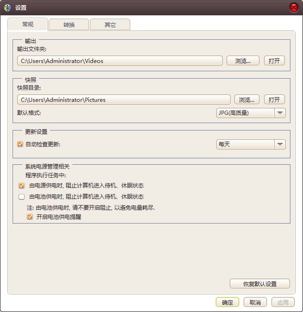 可以设置CPU内核编号,更改界面外观和语言,使用比特率计算器,启用GPU加速,指定默认输出目录,启用以防止在使用电池时待机或休眠以及自动检查更新。
