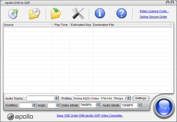 Apollo DVD to 3GP是一款创新的媒体转换工具,可直接将你喜爱的DVD影片转换为手机3GP视频格式您可以轻松转换PAL/NTSC数字视盘,在支持3GP格式的手机上进行优化视频播放。