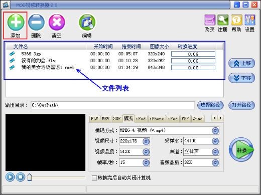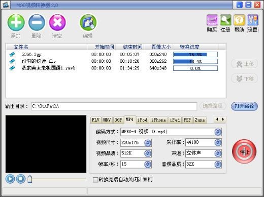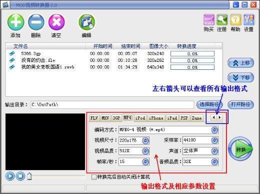 (2) 支持MOD等几乎所有的视频格式转换为 MP4、3G2、3GP、VOB、MOV、WMV、FLV等视频格式;