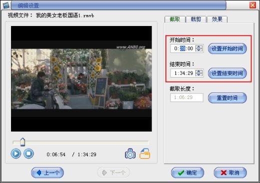 截取视频:点击截取选项,可以直接修改开始时间和结束时间,也可以播放预览到需要截取的部分,点击“设置开始时间”按钮来读取当前预览时间作为开始时间。点击“上一个”、“下一个”可以对所有添加进去的视频依次设置,设置好后点击确定按钮即可;