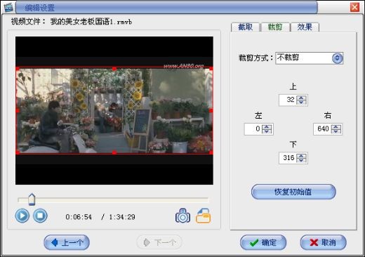 裁剪图像:点击裁剪选项,预览播放视频,图像上会出现红色选择框,可以直接使用鼠标在红色框上的小红方块来拖动选择区域,也可以直接在窗口右边修改上、下、左、右四个数值来决定选择区域,设置好后点击确定即可;
