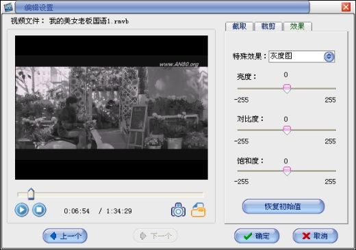(5) 视频编辑:可以指定时间截取视频片段转换;对图像进行裁剪;调节视频亮度、对比度、饱和度等特效;
