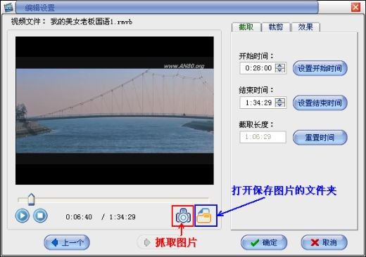 抓取精彩图片:在“编辑设置”对话框中,播放预览视频,遇到您喜欢的图像,可以点击下面图中红色框中的相机,可以快速抓取图片,自动保存输出JPG格式,点击蓝色框的按钮,可以查看图片存放的路径;