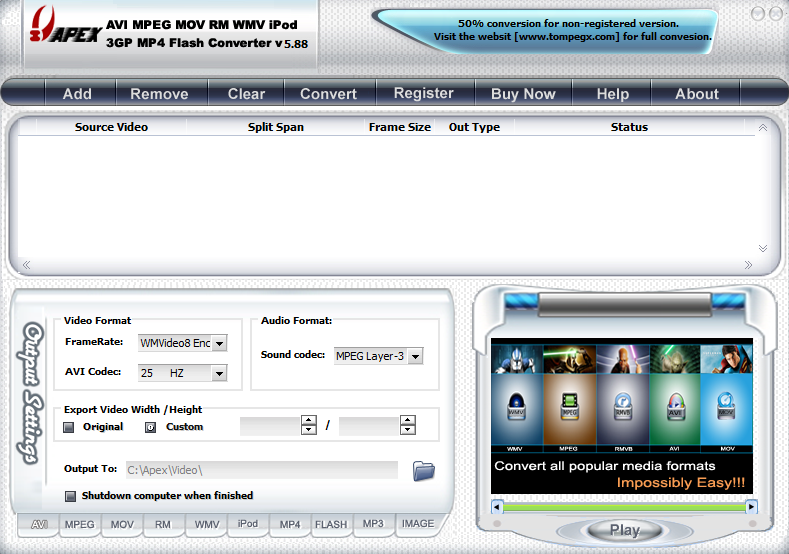 Apex MPEG RM WMV iPod 3GP MP4 Flash Converter是一款集多功能为一体的音像转换工具,支持当今流行的音像格式文件转换成avi mpeg mov wmv rm iPod 3gp flash swf flv mp3 zune mp4 等文件.