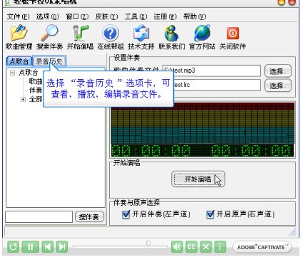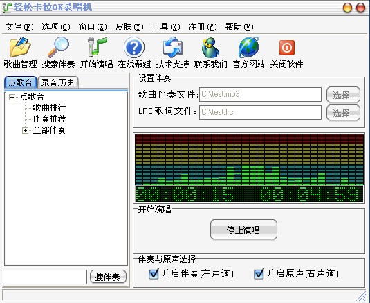 轻松卡拉OK录唱机是一款卡拉OK音乐播放、录音软件。使用它,您可轻松简单地在电脑上实现卡拉OK伴奏音乐的播放、演唱,并可通过本软件将您的歌声实时地录制到您的电脑硬盘中,以做永久的珍藏。