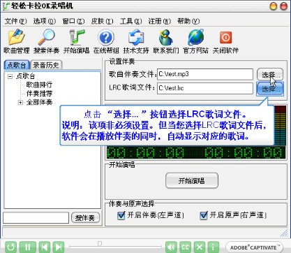 说明:该项必须设置,但当你选择LRC歌词文件后,软件会在播放伴奏的同时,自动显示对应歌词。