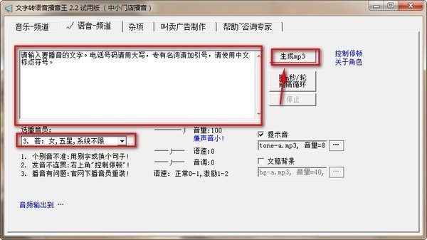 时方文字转语音播音王,文字转语音播音软件,中小门店播音神器,含音乐、语音两个不同优先级的频道。音乐频道用于营造氛围,手动播n秒或n首,可单曲、顺序或随机播。语音频道用于宣传促销,手动播n秒或n轮,可设置循环播放的间隔。语音频道播出时,音乐频道自动降低音量或静音。含叫卖广告制作功能,可制作带背景音乐的语音广告(mp3)。
