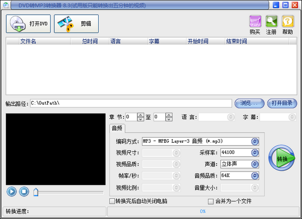 DVD转MP3转换器是一款功能强大的把DVD光盘输出音频的转换软件,它可以快速高质量地从DVD光盘中提取音频输出MP3,WMA,WAV,AAC,M4A等格式。它可以单独从DVD光盘中提取想要的精彩片段,也可以把多个片段合并输出一个文件。