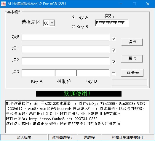 打开软件,插上Acr122读写器,安装好驱动,我们可以看到软件下方读写器链接的位置会提示读写器链接正常,我们可以选择扇区,选择密码类型,输入密码,然后点击读卡,就可以把卡内数据读出来,软件一次读出一个扇区的4块数据,块0,1,2可以完整读出,块3是密码块,KeyA不可以出出来,显示出来的是假的,KeyB有可能可以读出来,控制位一般也可以读出来。