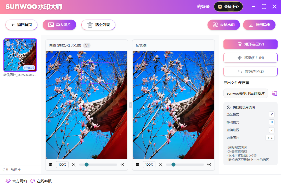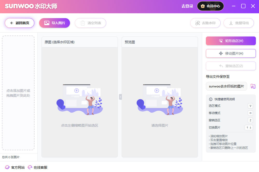 sunwoo水印大师是一款专业水印管理工具,提供去水印和加水印两大核心功能,集成AI大模型能力,智能去除水印,实时预览去除效果;支持添加文字水印和图片水印,自由度高,所见即所得。