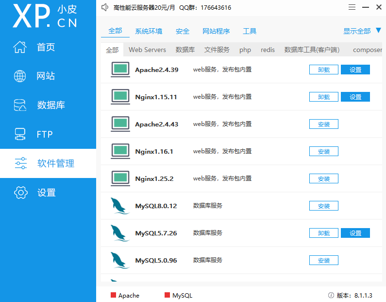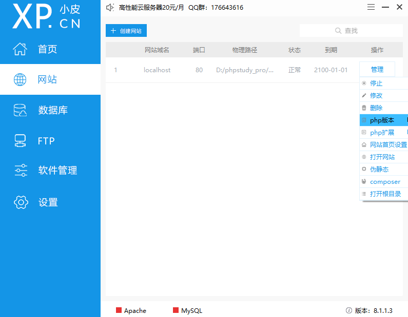 phpstudy(已升级为小皮面板)是一款专业性很强的服务器软件,为服务器环境提供极佳配置的解决方案,支持CentOS、Ubuntu、Debian、Fedora、deepin,Web端管理,QQ群及论坛技术支持一键创建网站、FTP、数据库、SSL;安全管理,计划任务,文件管理,PHP多版本共存及切换;自带LNMP与LAMP。