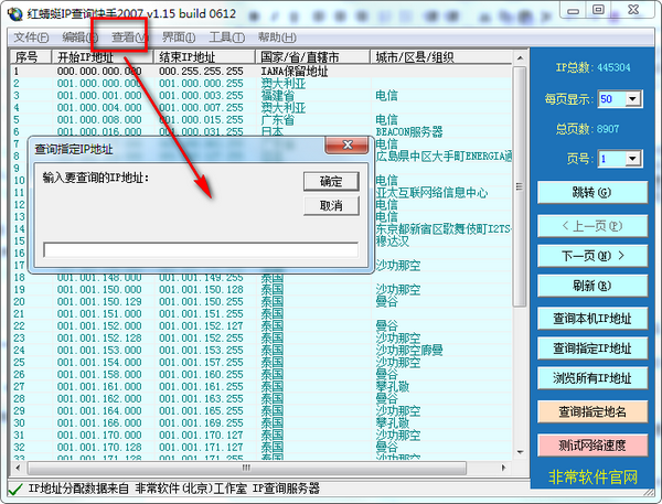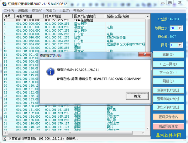 红蜻蜓IP查询快手用于查询IP地址分配情况,包含30多万条IP地址分配记录,可以对IP地址分配记录随意浏览及根据地名模糊查询,提供上下翻页,指定页号跳转,可随时设置每页显示的记录数;能够导出IP地址分配记录到csv文件或Access 2000 数据库(*.mdb);能够获取上网机器IP地址及所在地址位置;提供指定IP地址查询功能,只要输入一个IP地址即可查询到该IP地址已被分配给的国家/地区/城市/组织等信息,并可以测试网络速度。